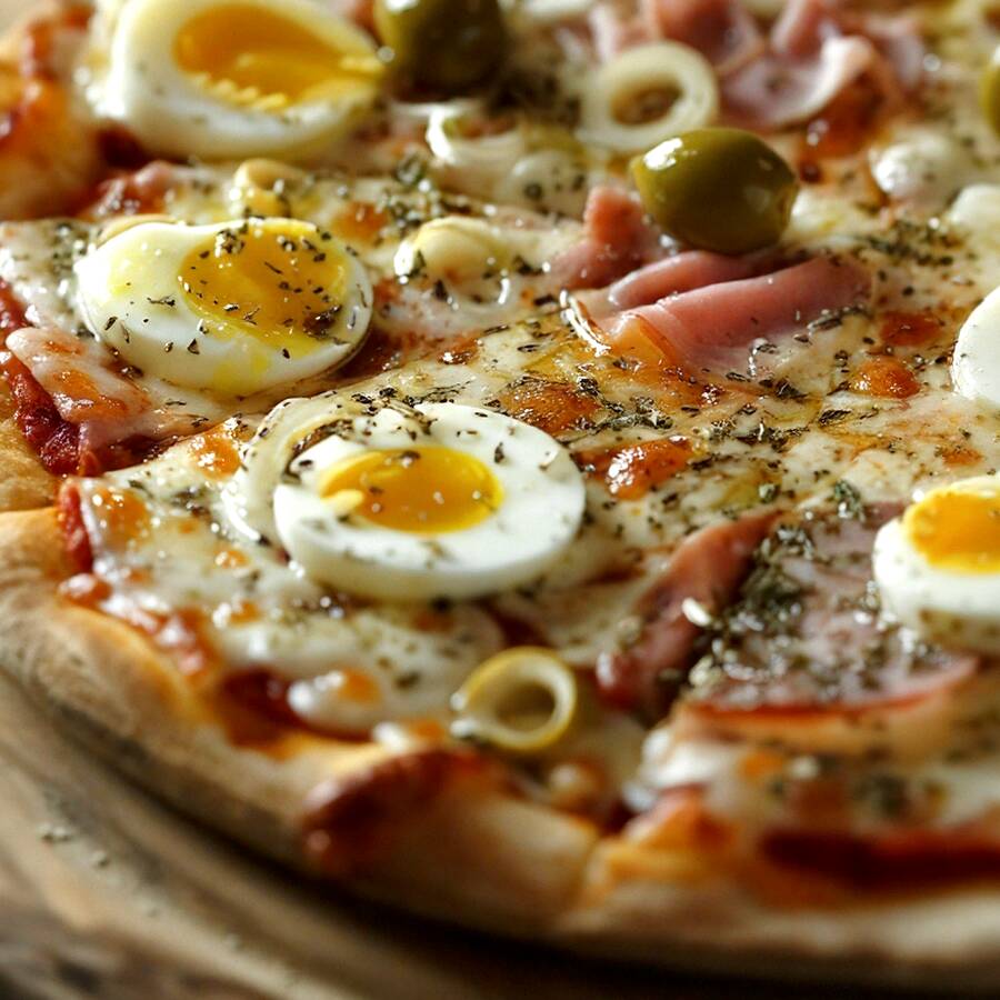 Massa artesanal, molho de tomate, muçarela, presunto, ovo, azeitona, oregano.