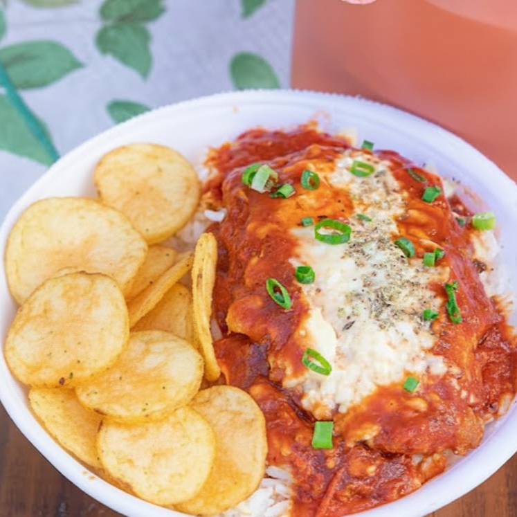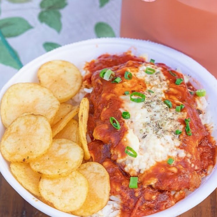 Parmegiana crocante de filezinho de frango + molho artesanal de tomate e mussarela + arroz soltinho e batata chips.