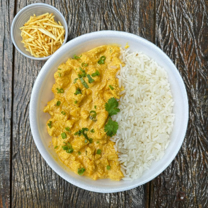Frango ao molho cremoso com arroz branco e batata palha. Uma combinação que agrada todo mundo. EMBALAGEM DE ALUMINIO OU ISOPOR