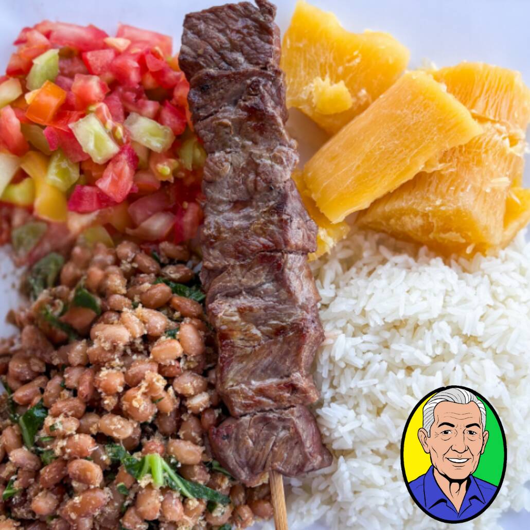 Marmita com Espetinho de Contra Filé Assado + Feijao Tropeiro com banana fritinha + Arroz Soltinho + Mandioca Cozida e Vinagrete Fresquinho. Uma Marmita Caprichada pra todo tipo de fome! Serve 1 pessoa - Aprox. 650g EMBALAGEM DE ALUMINIO OU ISOPOR