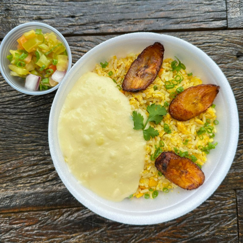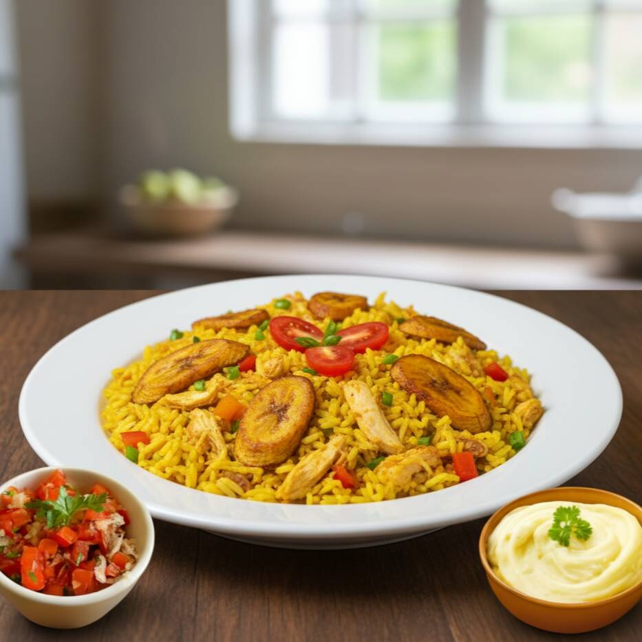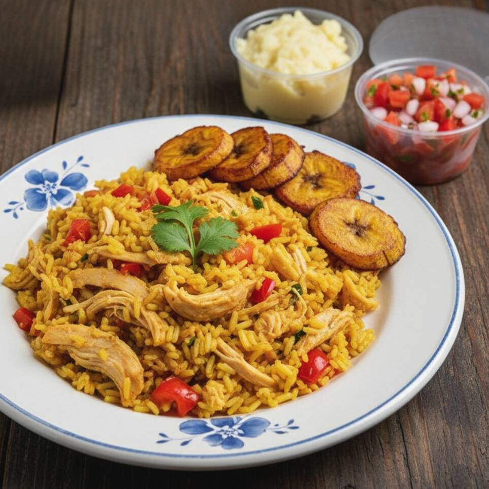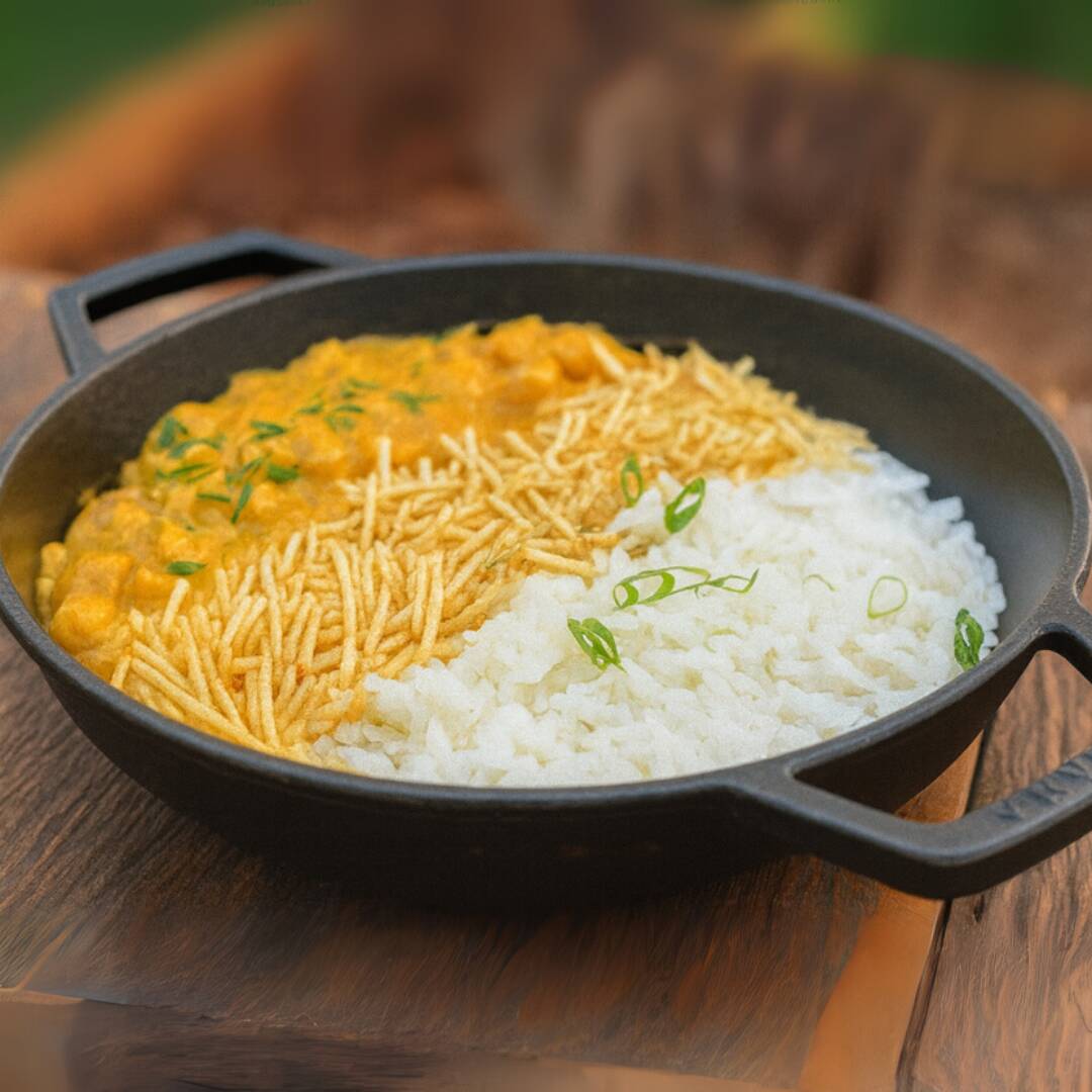 Arroz bem temperado com frango desfiado, servido com purê de batata macio e vinagrete fresco. Uma combinação leve, colorida e cheia de sabor.