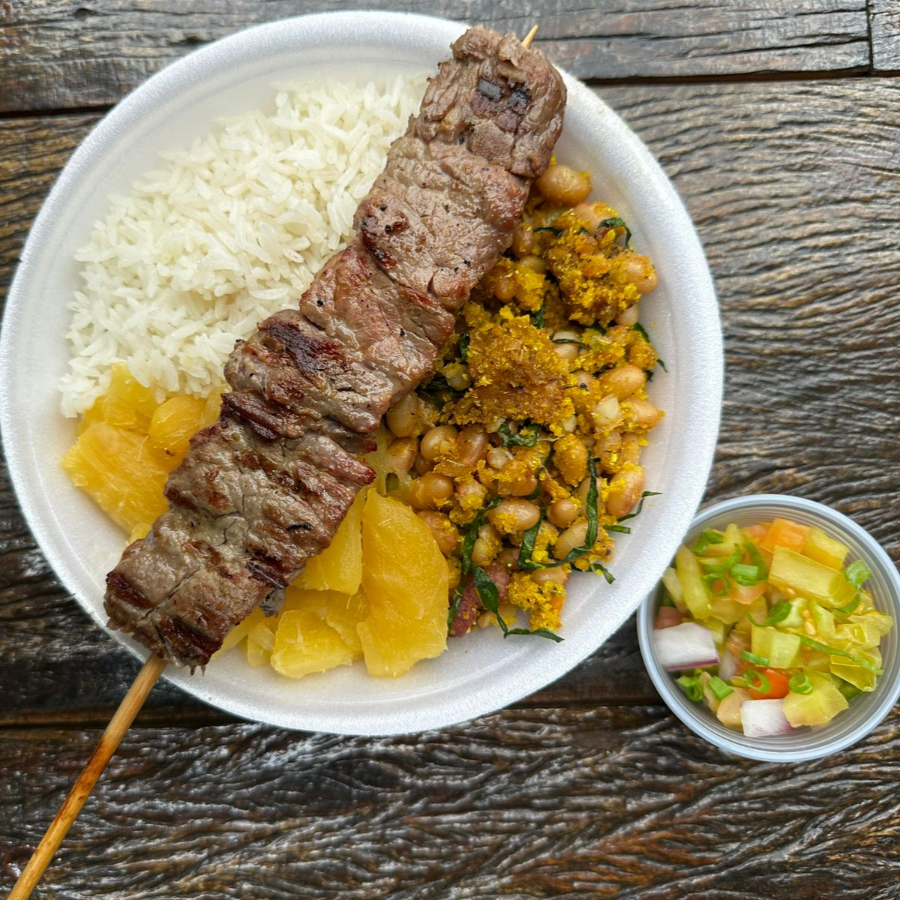 Marmita com Espetinho de Contra Filé Assado + Feijao Tropeiro com banana fritinha + Arroz Soltinho + Mandioca Cozida e Vinagrete Fresquinho. Uma Marmita Caprichada pra todo tipo de fome! Serve 1 pessoa - Aprox. 650g