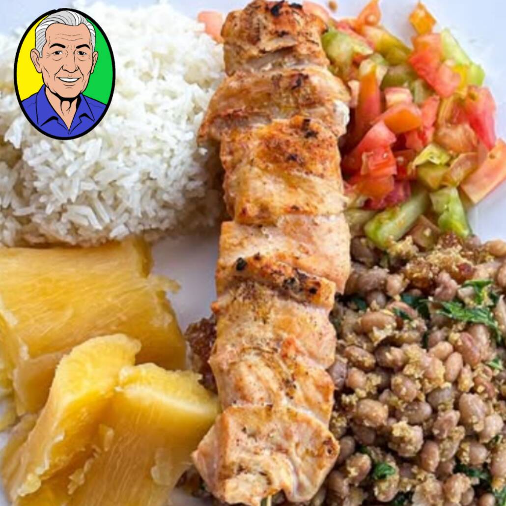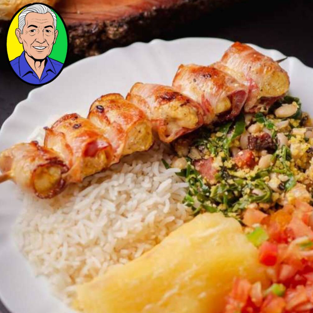 Marmita com Espetinho Frango e Bacon + Feijao Tropeiro com banana fritinha + Arroz Soltinho + Mandioca Cozida e Vinagrete Fresquinho. Uma Marmita Caprichada pra todo tipo de fome! Serve 1 pessoa - Aprox. 650g – CHURRASCO EMBALAGEM DE ALUMINIO OU ISOPOR
