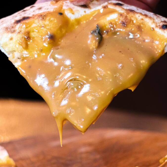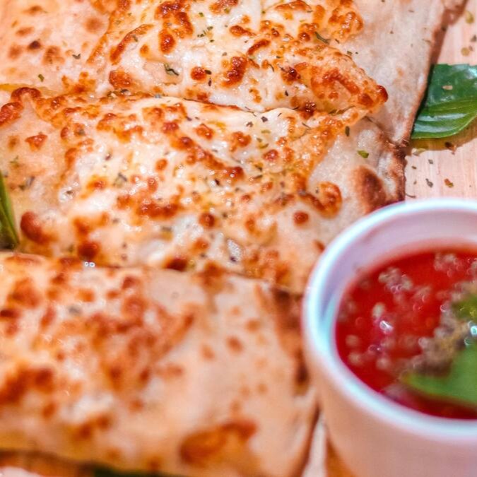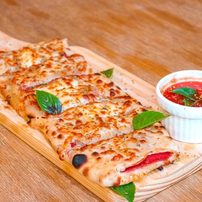 Enroladinho na massa de pizza com mozzarella, provolone, Catupiry e parmesão.