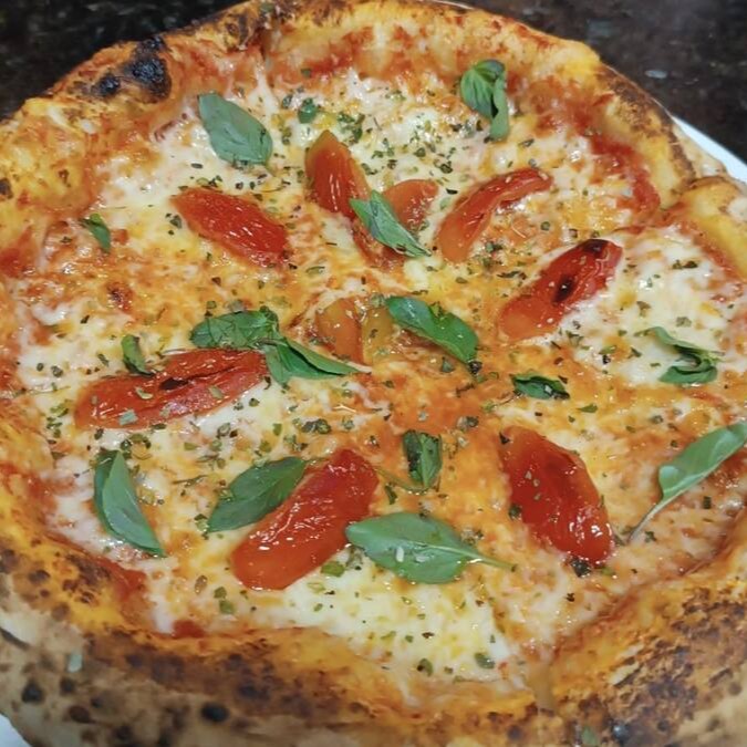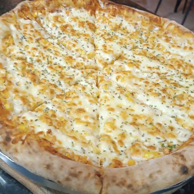 Massa de longa fermentação, molho italiano, frango desfiado, milho, mussarela, Catupiry e manjericão