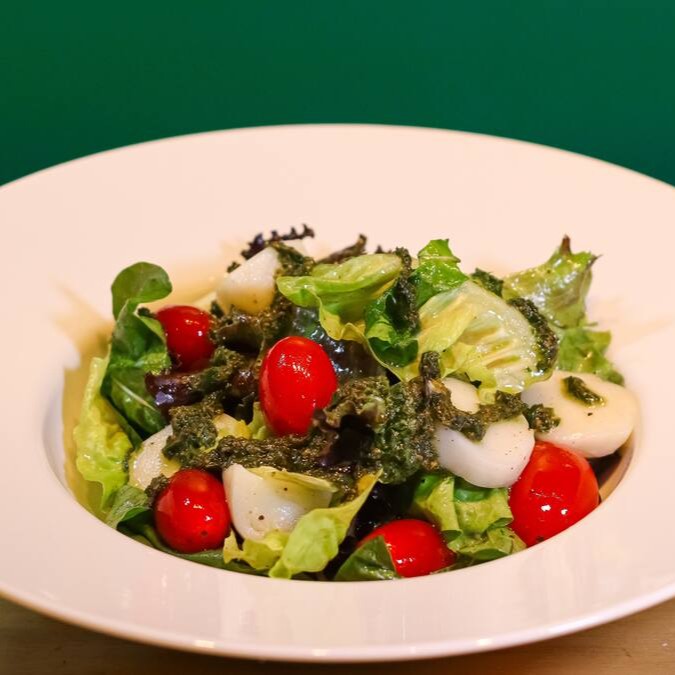 Apresentamos nossa 'Salada da Casa com Tiras de Frango', uma entrada elegante e saborosa! Esta salada inesquecível é meticulosamente preparada com um mix diversificado de folhas frescas e crocantes, tomate confit suavemente adocicado, pesto de manjericão aromático e envolvente, mozzarella de búfala suave e cremosa, e um vinagrete de limão e mel, que adiciona um toque cítrico e doce na medida certa. Para completar, tiras de frango suculentas e bem temperadas proporcionam uma explosão de sabor. Esta é a escolha perfeita para quem busca uma entrada leve, mas repleta de personalidade!