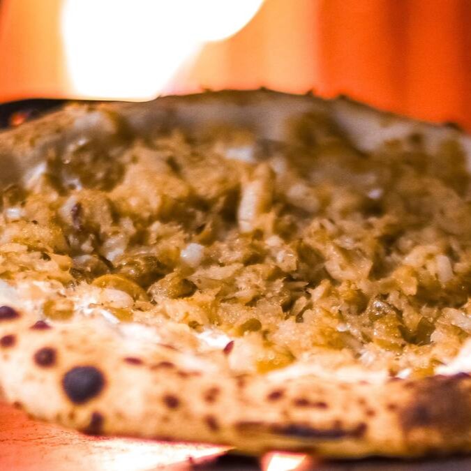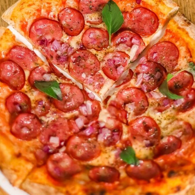 Massa de longa fermentação, molho italiano, mussarela, calabresa fatiada, cebola roxa e manjericão
