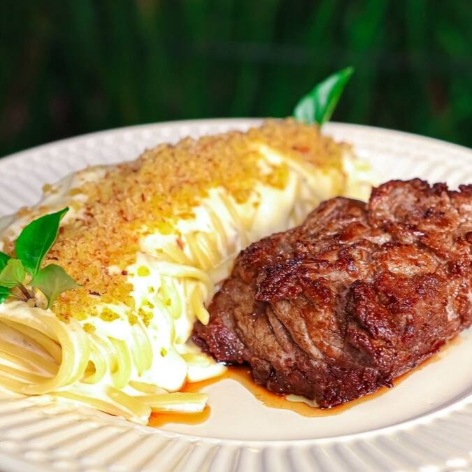Este 'Linguine Aglio e Olio com Bife de Chorizo' é uma obra-prima culinária de nossa categoria 'Massas da Casa'. O prato traz um suculento bife de chorizo, finamente maturado, que é grelhado à perfeição para realçar seu sabor robusto e textura rica. Acompanha-se de um macarrão linguine, delicadamente cozido 'al dente', enriquecido com um molho de alho e óleo, que impregna cada fibra de massa com uma combinação irresistível de aromas e sabores. Uma experiência gastronômica sublime!