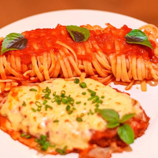 Desfrute de nosso exuberante 'Fettuccine com Parmegiana de Frango', uma especialidade pertencente à categoria 'Massas da Casa'. Este prato apresenta fettuccine fresco e habilmente cozido, que é então envolto em um molho de tomate robusto e ricamente saboroso. O destaque é o frango empanado parmegiana, crocante por fora e suculento por dentro, coberto com uma generosa camada de queijo derretido e dourado. Uma combinação irresistível de sabores que promete uma experiência culinária verdadeiramente memorável.