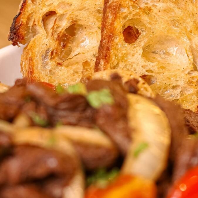 Tiras de filé mignon, acompanhado com fonduta de queijos e pães.