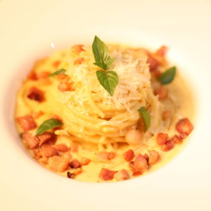 Sob a categoria 'Massas da Casa', apresentamos o 'Espaguete à La Carbonara'. Este prato é uma sinfonia de sabores, onde cada nota é interpretada por um ingrediente de alta qualidade. A base é um macarrão tipo rigatoni, perfeitamente cozido até o ponto al dente. Este se une a um molho cremoso e suave, elaborado com ovos frescos e queijo Grana Padano, cuja autenticidade e sabor único elevam o prato a outro nível. E, para finalizar com chave de ouro, o bacon crocante adiciona a pitada perfeita de salgadinho. Uma verdadeira experiência italiana em cada garfada.