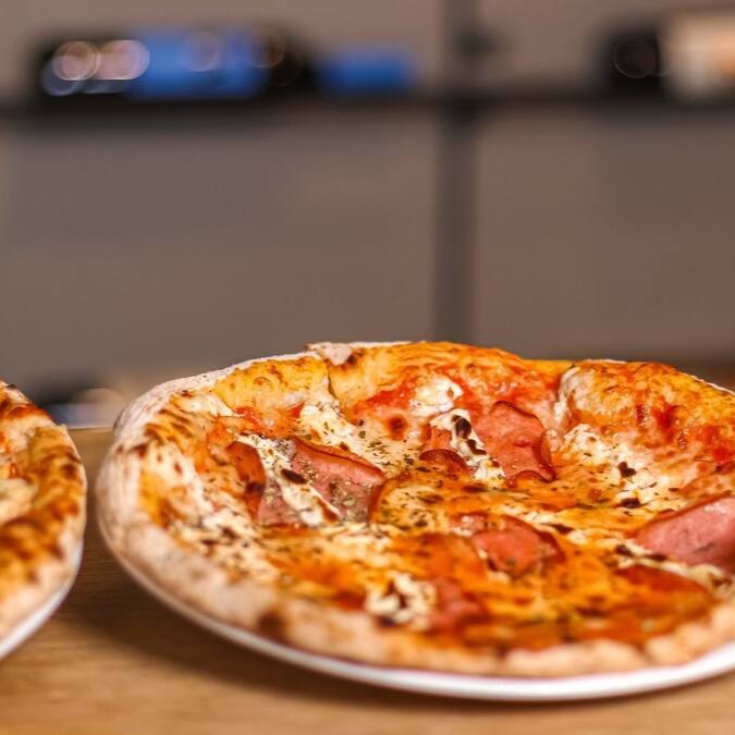 Massa de longa fermentação, molho italiano, mussarela, lombo canadense, cream cheese Philadelphia e manjericão