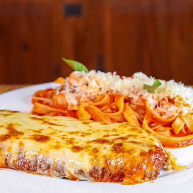Fettuccine ao molho com Parmegiana de Filé Mignon.
