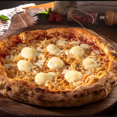 MASSA , MOLHO, MUSSARELA , FRANGO DESFIADO , CATUPIRY , AZEITONA E OREGANO