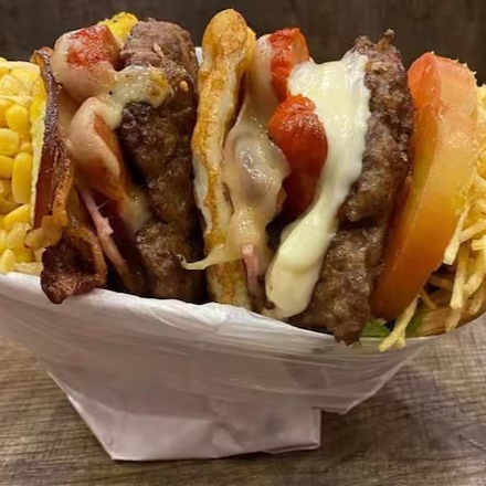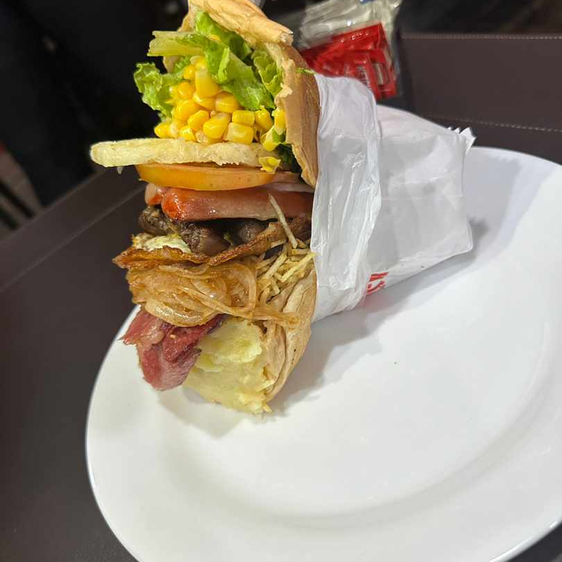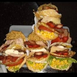 PAO,1 HAMBURGUER , 1 FRANGO , 1 LOMBO , MUSSARELA,PRESUNTO, OVO, BACON , SALSICHA , ALFACE , TOMATE , MILHO, ABACAXI , BATATA PALHA , PURE DE BATATA
