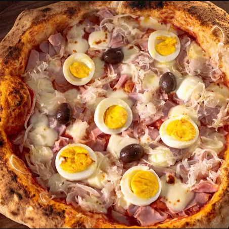 MASSA , MOLHO, MUSSARELA , TOMATE , PIMENTAO , OVO , CALABRESA , BACON , MILHO, CEBOLA , AZEITONA E OREGANO