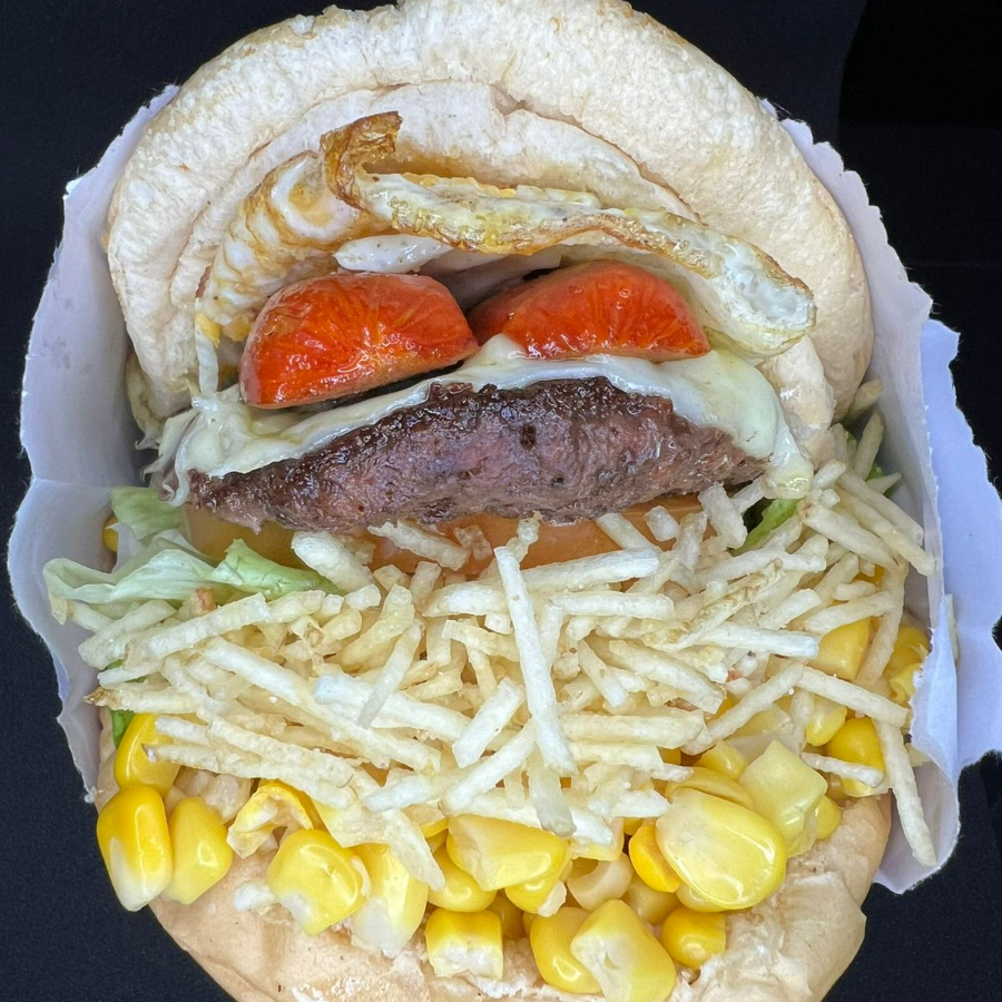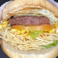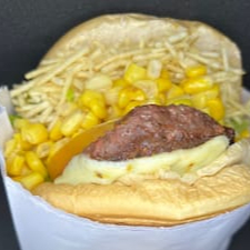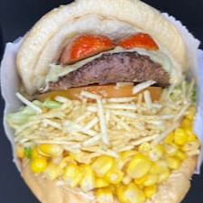 pão, hamburguer, queijo, alface, tomate, milho e batata palha