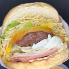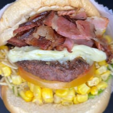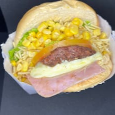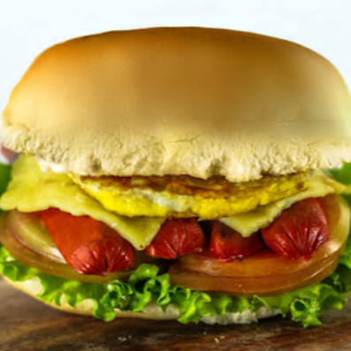 pão de hamburguer, hamburguer, mussarela, salsicha, ovo, alface , tomate, milho e batata.