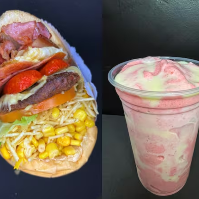 x- tudo com milho e batata e um delicioso creme de morango de 500 ml
