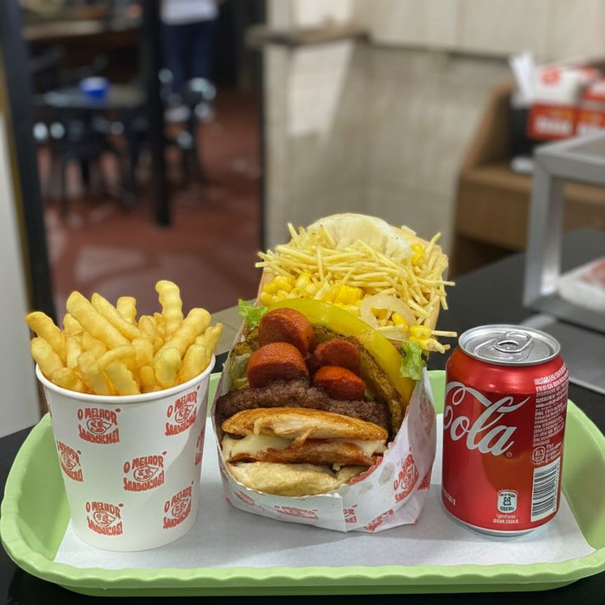 Pão, Carne, Bacon, Presunto, Mussarela, Tomate, Alface, Milho, Batata e Abacaxi