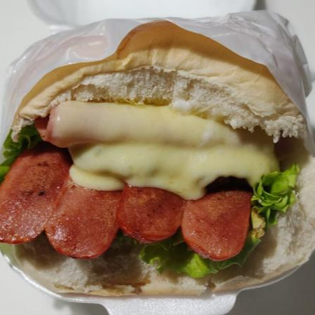 Pão, Carne, Bacon, Ovo, Presunto, Mussarela, Tomate, Alface, Milho, Batata e Abacaxi