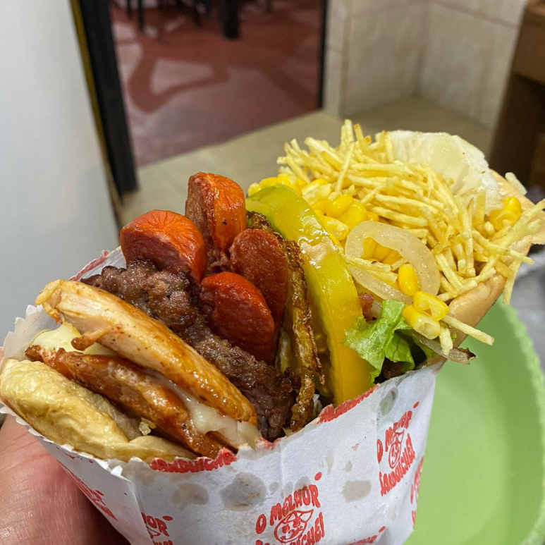 Pão, Carne, Salsicha , Ovo, Bacon, Presunto, Mussarela, Tomate, Alface, Milho, Batata e Abacaxi