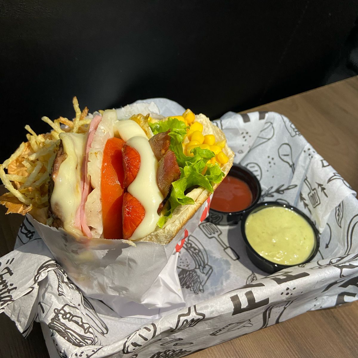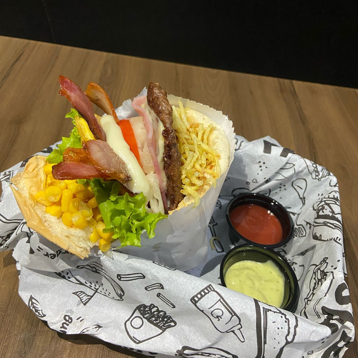 Pão, hamburguer bovino, ovo, presunto, queijo mussarela, alface, tomate, abacaxi, milho e catupiry