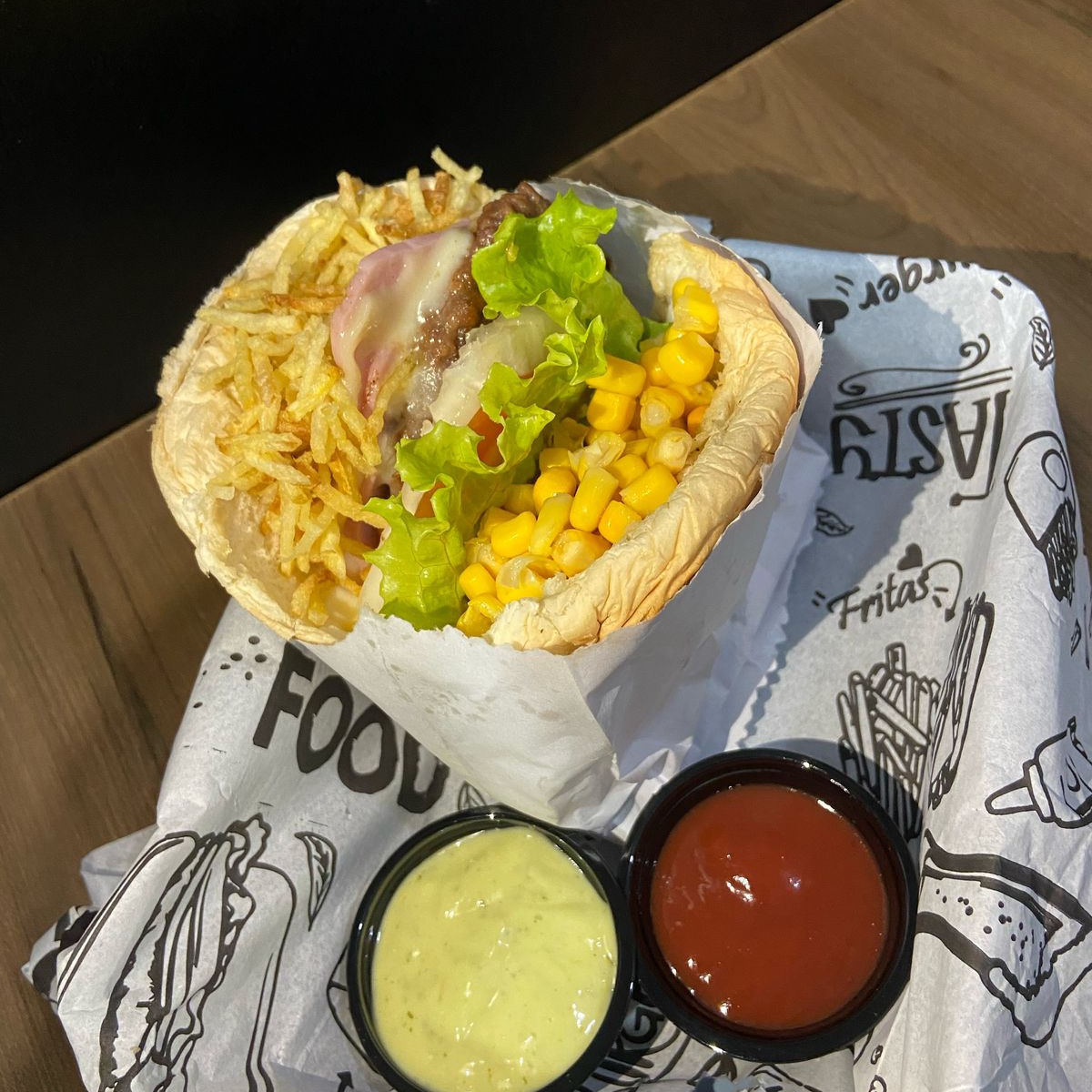 Pão, hamburguer, ovo, presunto, mussarela, alface, tomate, batata palha, abacaxi, milho e catupiry
