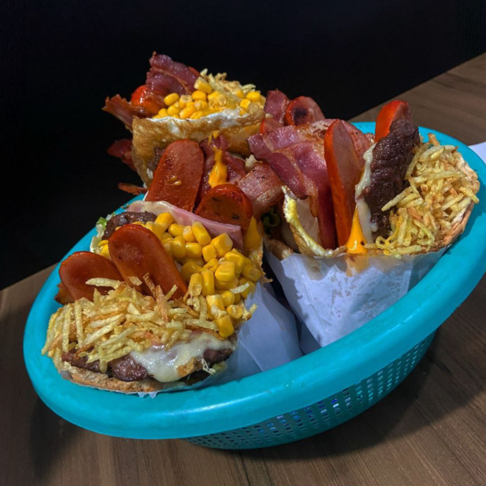 Pão, hamburguer, 2 bacon, presunto, mussarela, alface, tomate, batata palha, abacaxi, milho e catupiry