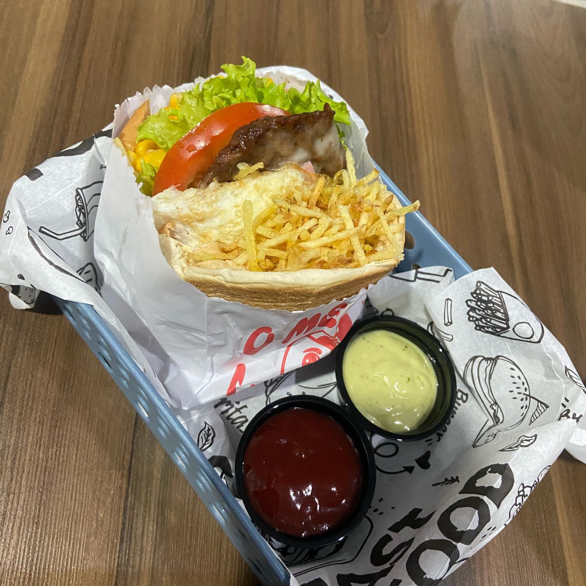 Pão, frango, ovo, bacon, salsicha, presunto, queijo, alfa tomate, abacaxi, batata, milho e catupiry
