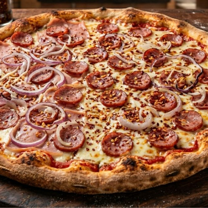 Molho, Mussarela, Calabresa, Cebola, Pimenta-Calabresa e Orégano