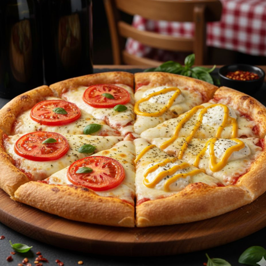 Pizza Metade Mussarela, Metade Três Queijos