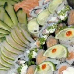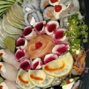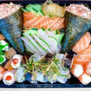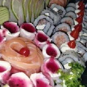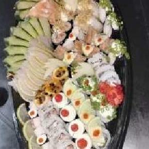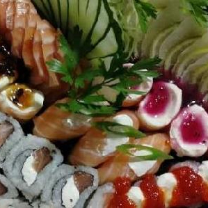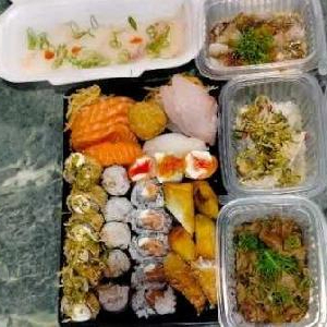 20 Sashimis de salmão, 20 sashimi de tilápia, 30 sushi especiais, 10 gunkas, 10 uramakis, 10 hossomaki, 10 shakes edy, 10 hakussai maki, (em duas barcas )