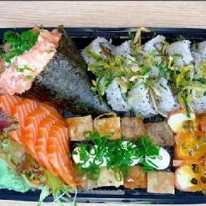 10 Sashimi de salmão, 10 sashimi de tilápia, 4 gunkan de salmão, 4 gunkan de tilápia, 4 niguiri de salmcão, 4 niguiri skin, 7 uramaki de salmão, 10 uramaki skinroll, 4 uramaki morango, 4 uramaki kani, 10 hot filadélfia, 4 hossomaki salmão, 5 hossomaki tilápia