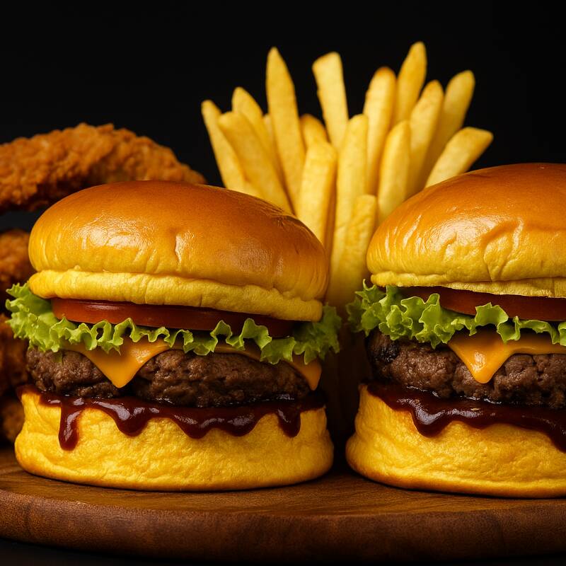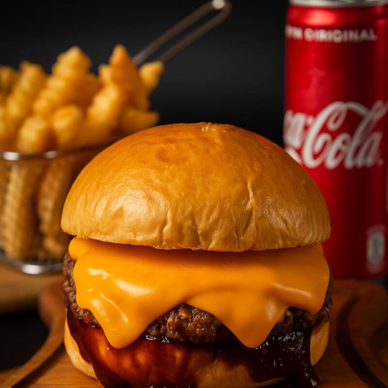 Leva um delicioso pão fresco de sua escolha, carnes selecionadas de 120g, 3 fatias de queijo cheddar + batata frita de 150g in nature + refrigerante. (leva 2 molhos de sua preferencia separadamente))