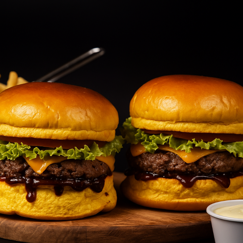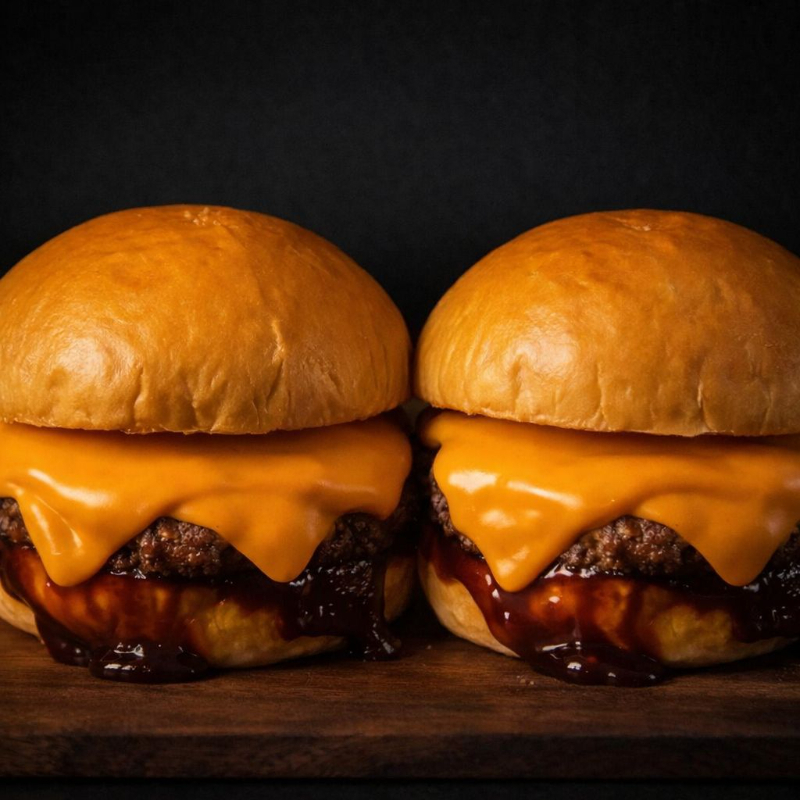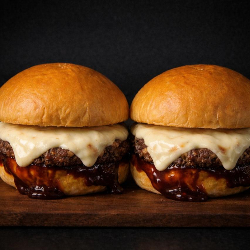 Leva dois hambúguers com pão selado na manteiga, hambúguer artesanal de 120g e 3 fatias de queijo cheddar. ( leva molho separadamente de sua escolha )