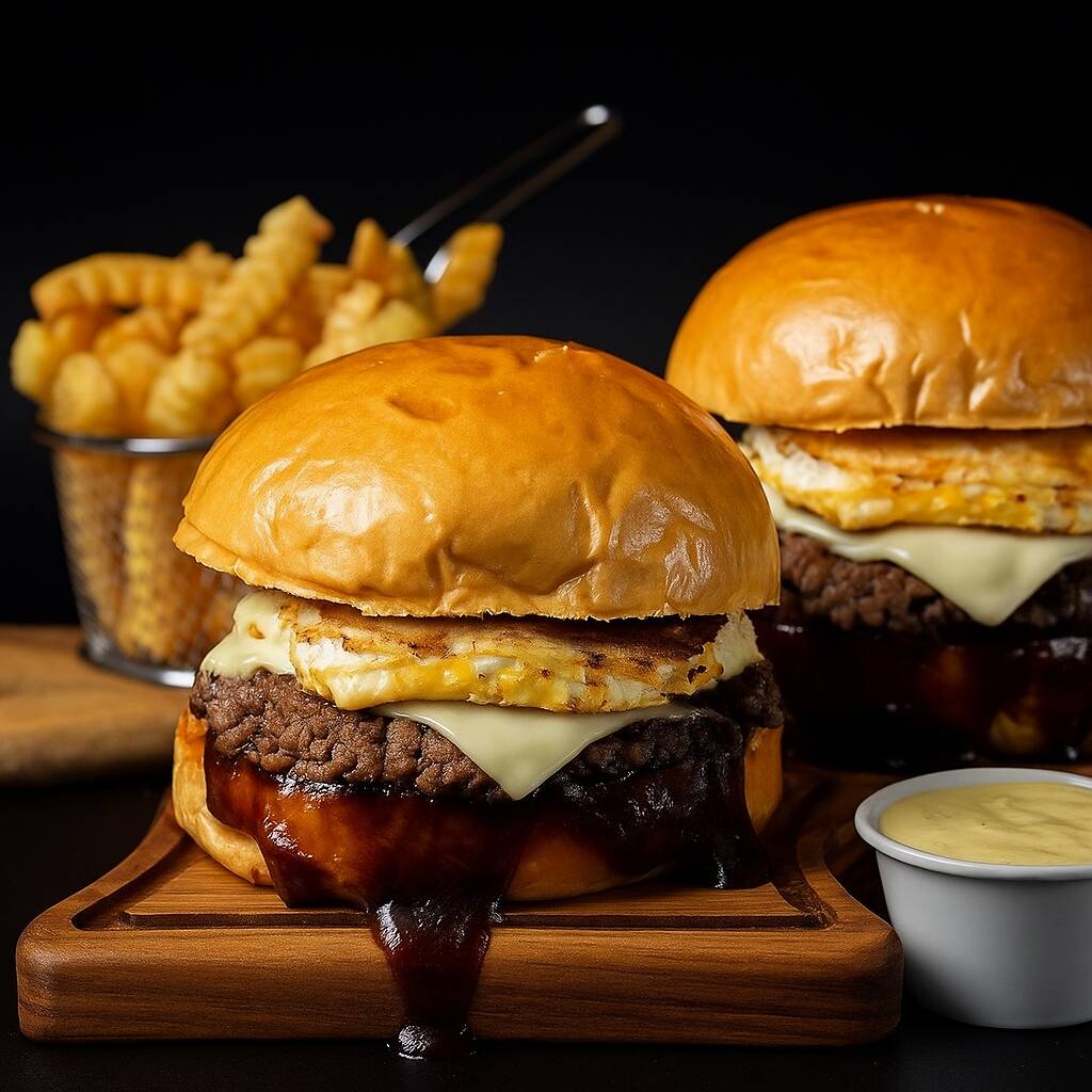 Este combo leva 2 hambúrgueres( Pão selado na manteiga, hambúrguer artesanal de 120g, queijo muçarela e ovo) + batata frita 300g in nature. (leva 2 molhos separadamente)