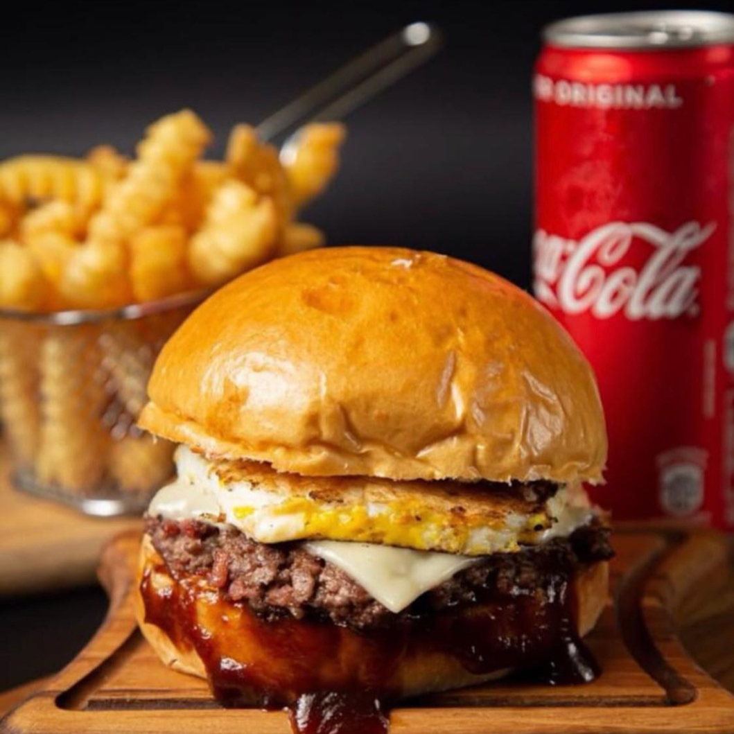 Leva pão selado na chapa com manteiga, hambúrguer artesanal feito de carnes de frescas de 120g, queijo muçarela e ovo frito + batata P 150g in nature+ refrigerante.