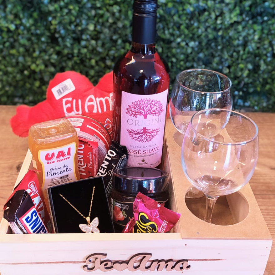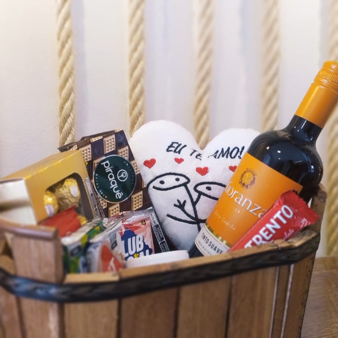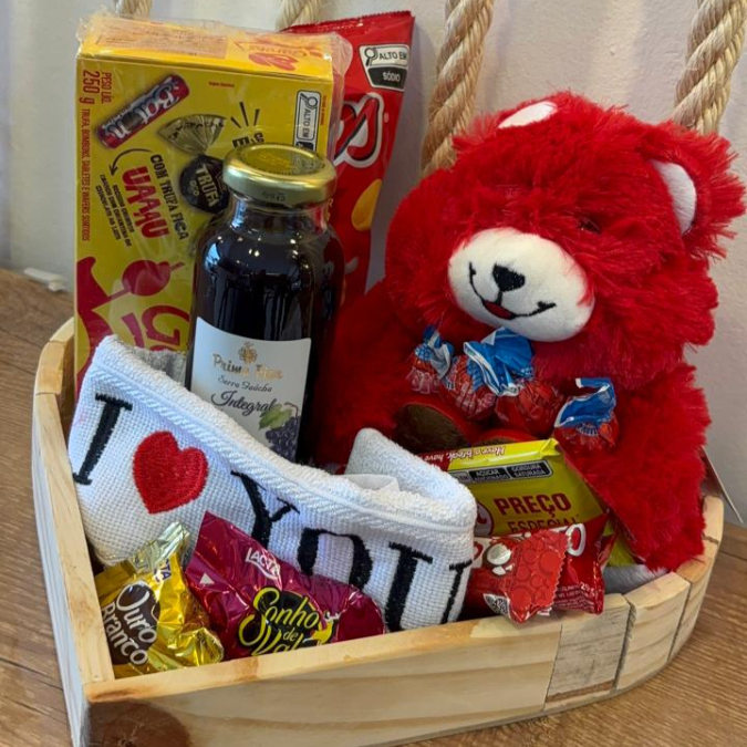 1 TOALHA ``I LOVE YOU``, 1 SONHO DE VALSA, 1 OURO BRANCO, 1 SUCO DE UVA 300 ML PRIMO FIOR, 1 PRESTIGIO, 1 TRENTO CHOCOLATE, 1 CAIXA DE BOMBOM GAROTO, 1 SALGADINHO MICOS PRESUNTO, 4 PIRULITO BIG BIG, 1 KIT KAT, 1 URSO VERMELHO E CAIXA DE MDF
