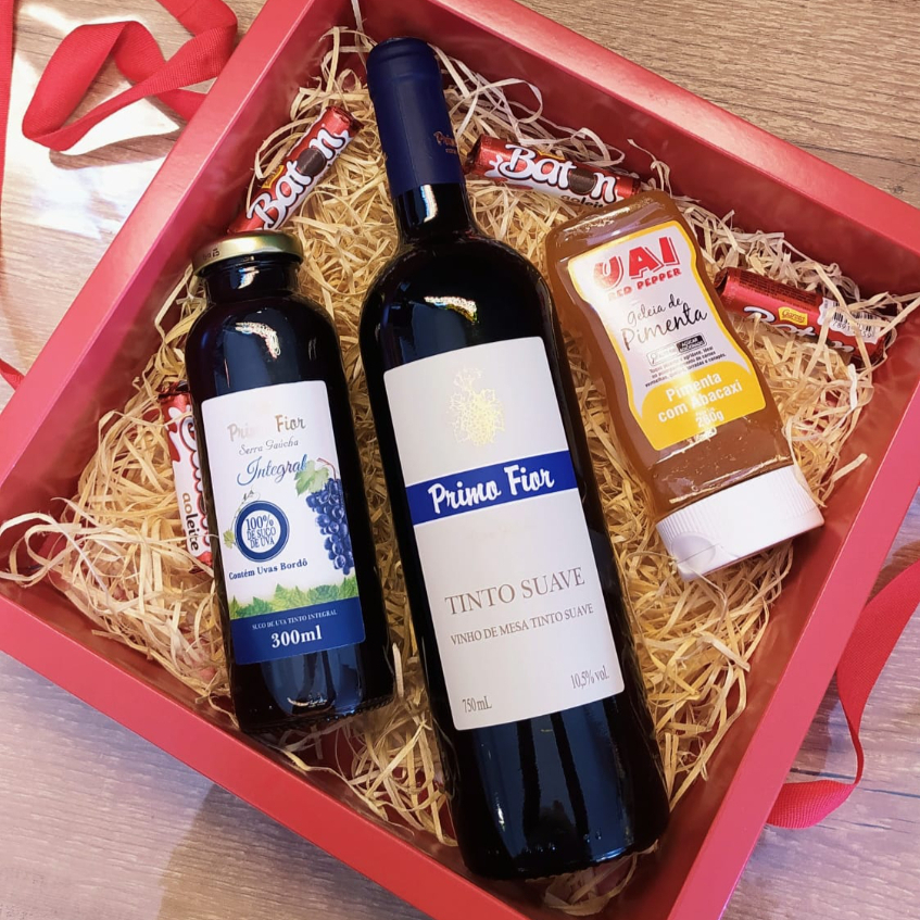 1 VINHO TINTO SUAVE AZUL, 1 SUCO DE UVA NATURAL 300ML, 1 GELEIA ABACAXI COM PIMENTA, 4 BATON.