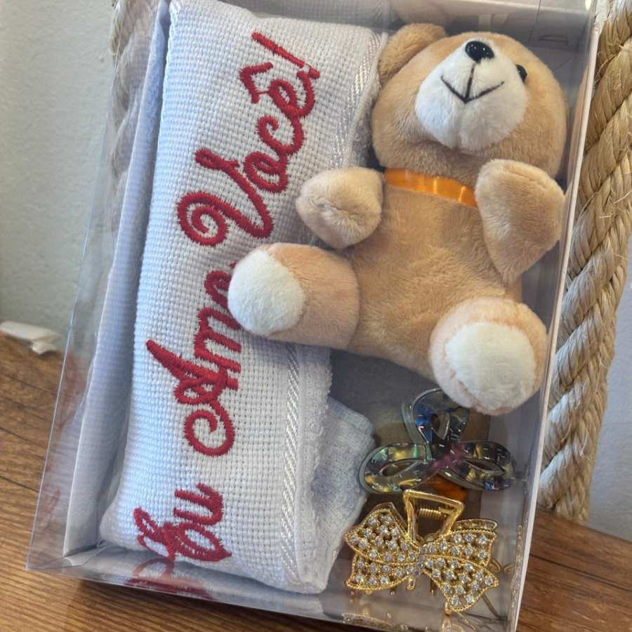 1 TOALHA ``EU AMO VOCE``, 1 CHAVEIRO URSO FOFINHO, 1 PRENDEDOR DE CABELO DE PLASTICO, 1 PRENDENDOR DE METAL COM STRASS