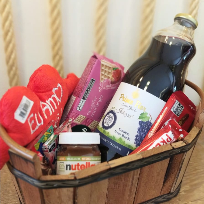 1 CORAÇÃO DE PELUCIA, 1 NEUWAFER DE MORANGO, 1 BISCOITO CLUB SOCIAL PRESUNTO, 1 CHOCOLATE TRENTO, 1 NUTELLA, 1 PRESTIGIO, 1 KIT KAT, 1 SUCO DE UVA PRIMO FIOR 1L. 1 BOLACHA CLUB SOCIAL PIZZA.