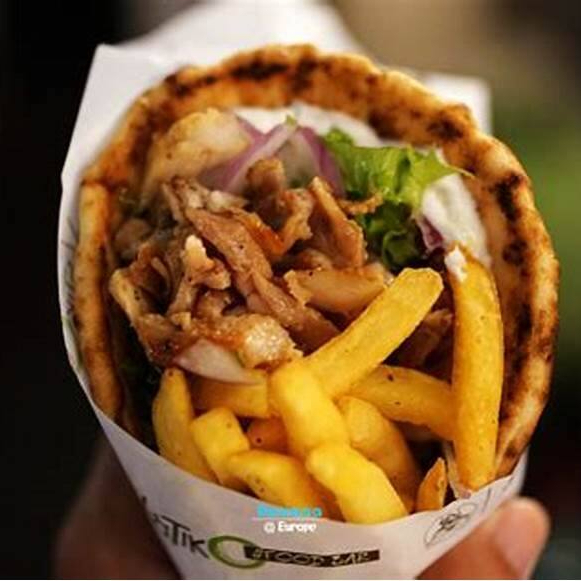 Shawarma de carne bovina c/ Fritas: Acompanhamento: Alface,Tomate, Pepino Japonês, coentro , Cebola Roxa e Pastade alho dentro .