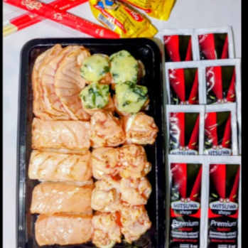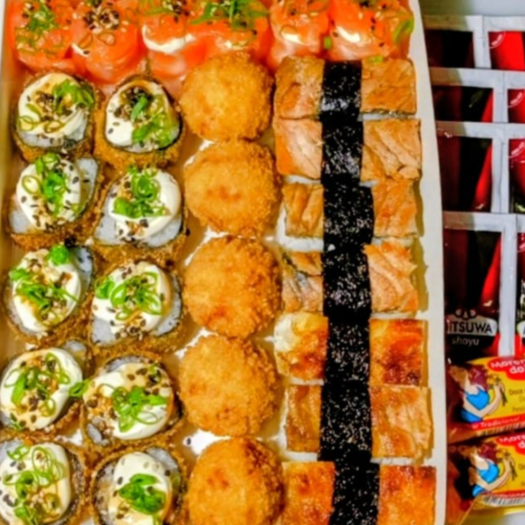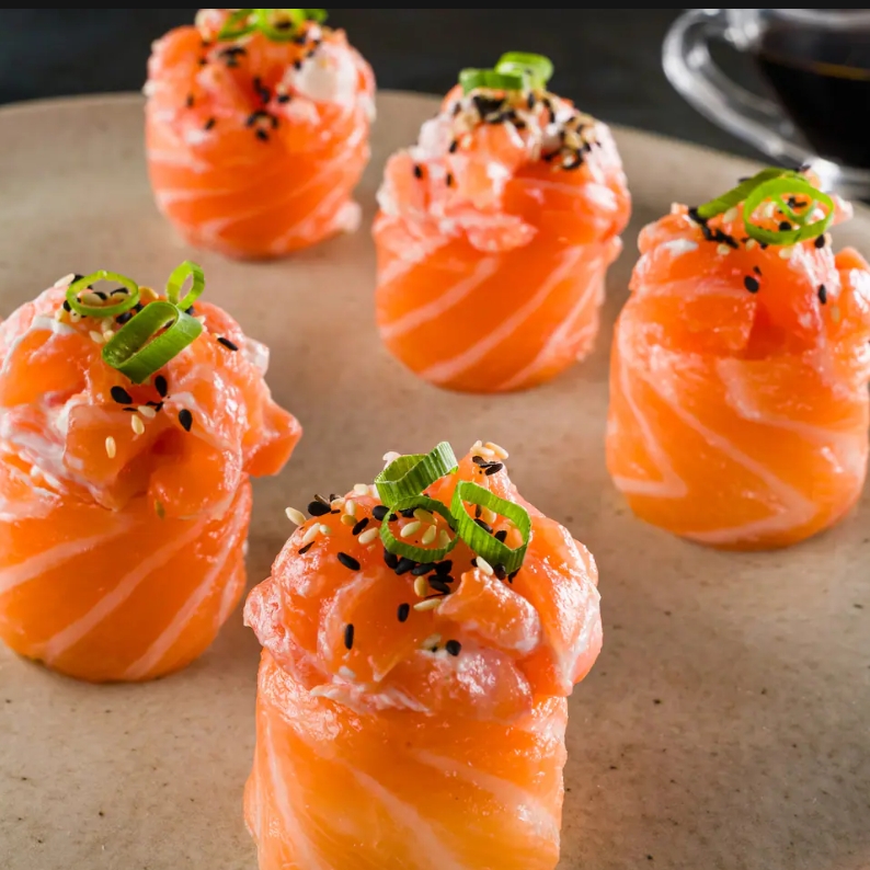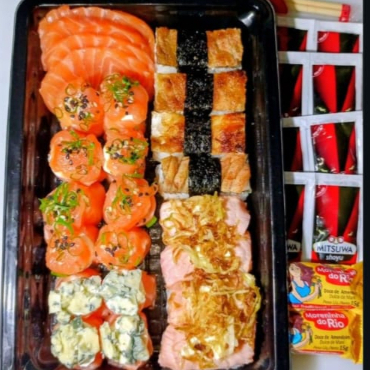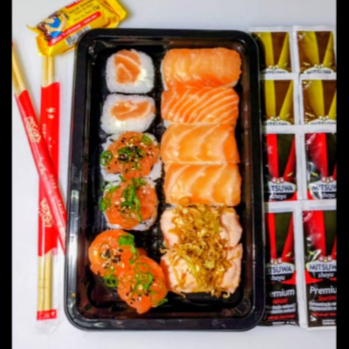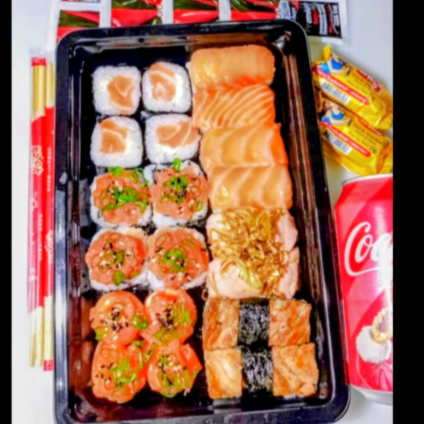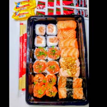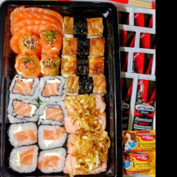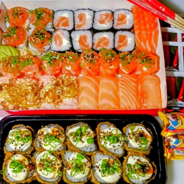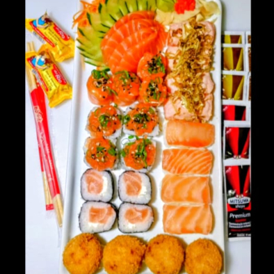 4) niguiri especial 4)niguiri filadélfia 4)gunka com paté de Salmão 4) Sashimi de Salmão Selado 4)Sashimi de Salmão 8) uramaki filadélfia 4) gunka de Cream cheese 10) Hot 8) Supremo Holl de Banana