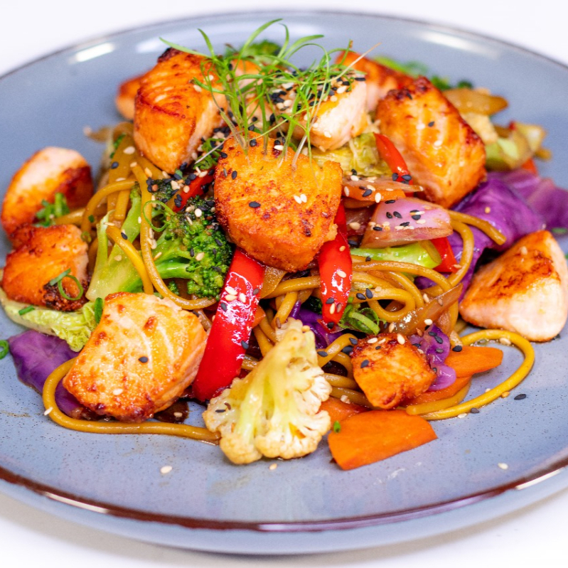 uma versão leve e sofisticada do nosso clássico Yakissoba de Salmão é preparado com a massa tradicional cubos de salmão frescos e suculentotudo é salteado em um molho especial que realça o sabor perfeita para quem busca uma opção diferente