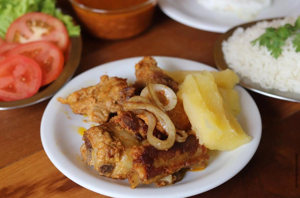 Super bem servida vai arroz com feijão e aquela costelinha de porco top.