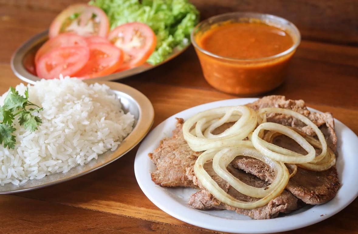 Super bem servida vai arroz com feijão e saboroso bife acebolado.