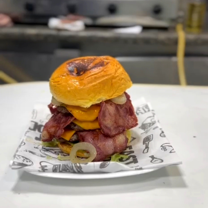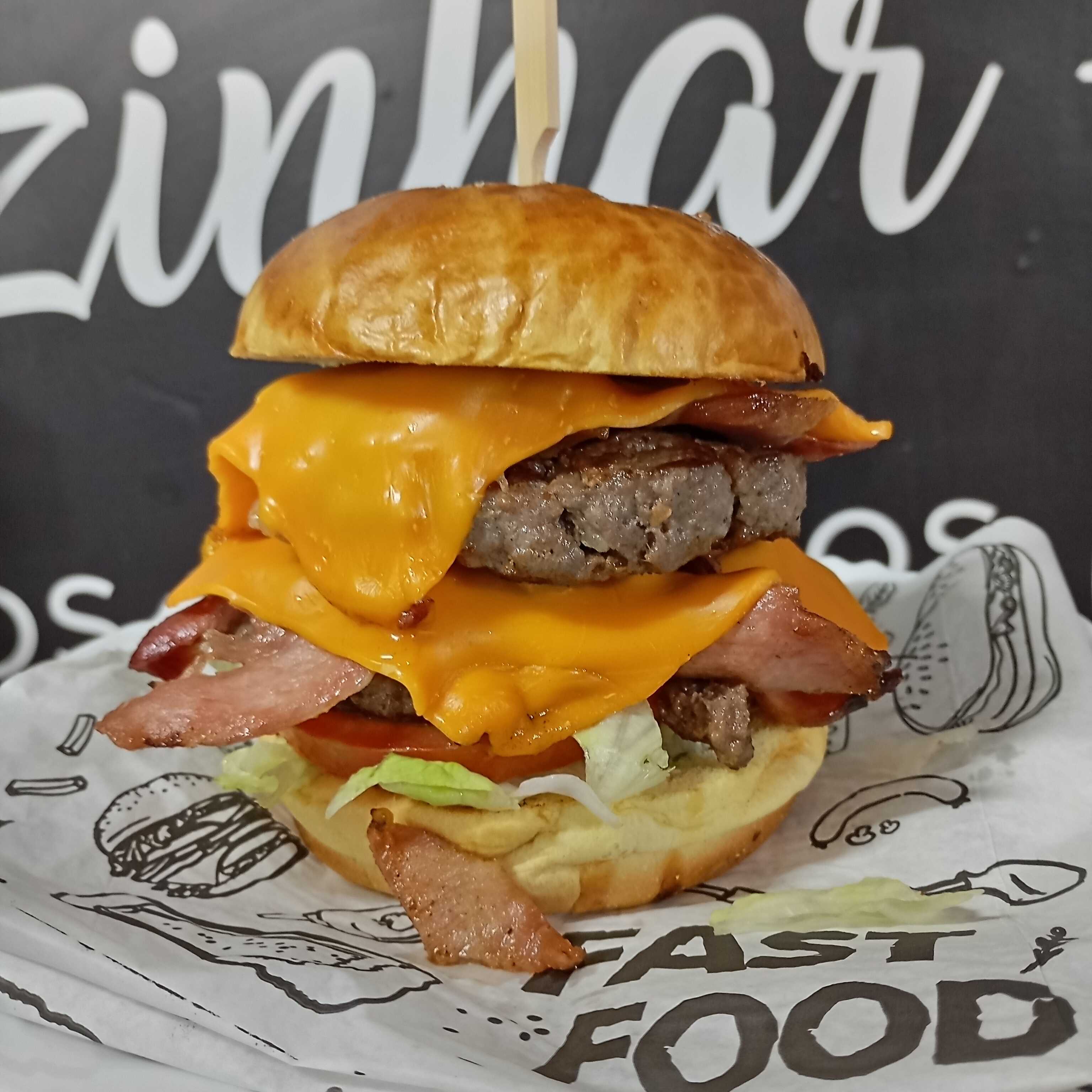 pao brioche 2 hamburguer cheddar fatia bacon alface tomate