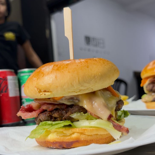 pao brioche 2 hambuguer cheddar fatia bacon alface tomate