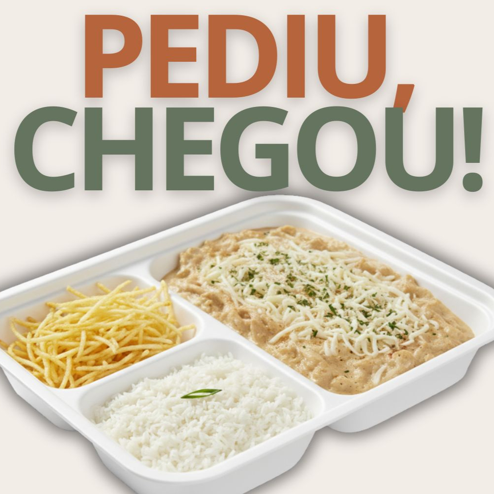 Fricassê de frango cremoso, com temperos naturais, acompanhado de arroz branco e batata palha à parte + refrigerante lata palito. Marmita com aprox. 350g.